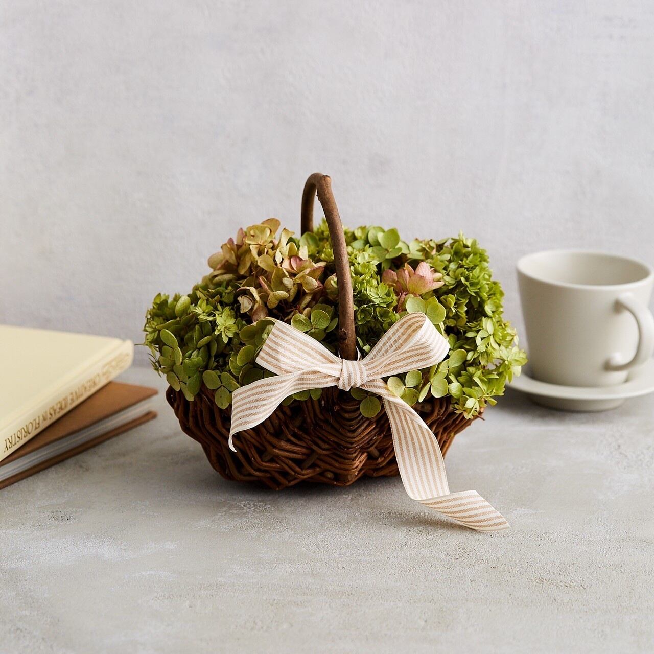長野県産のアナベルをドライにして、シックな単色シンプルアレンジメントに仕立てました。