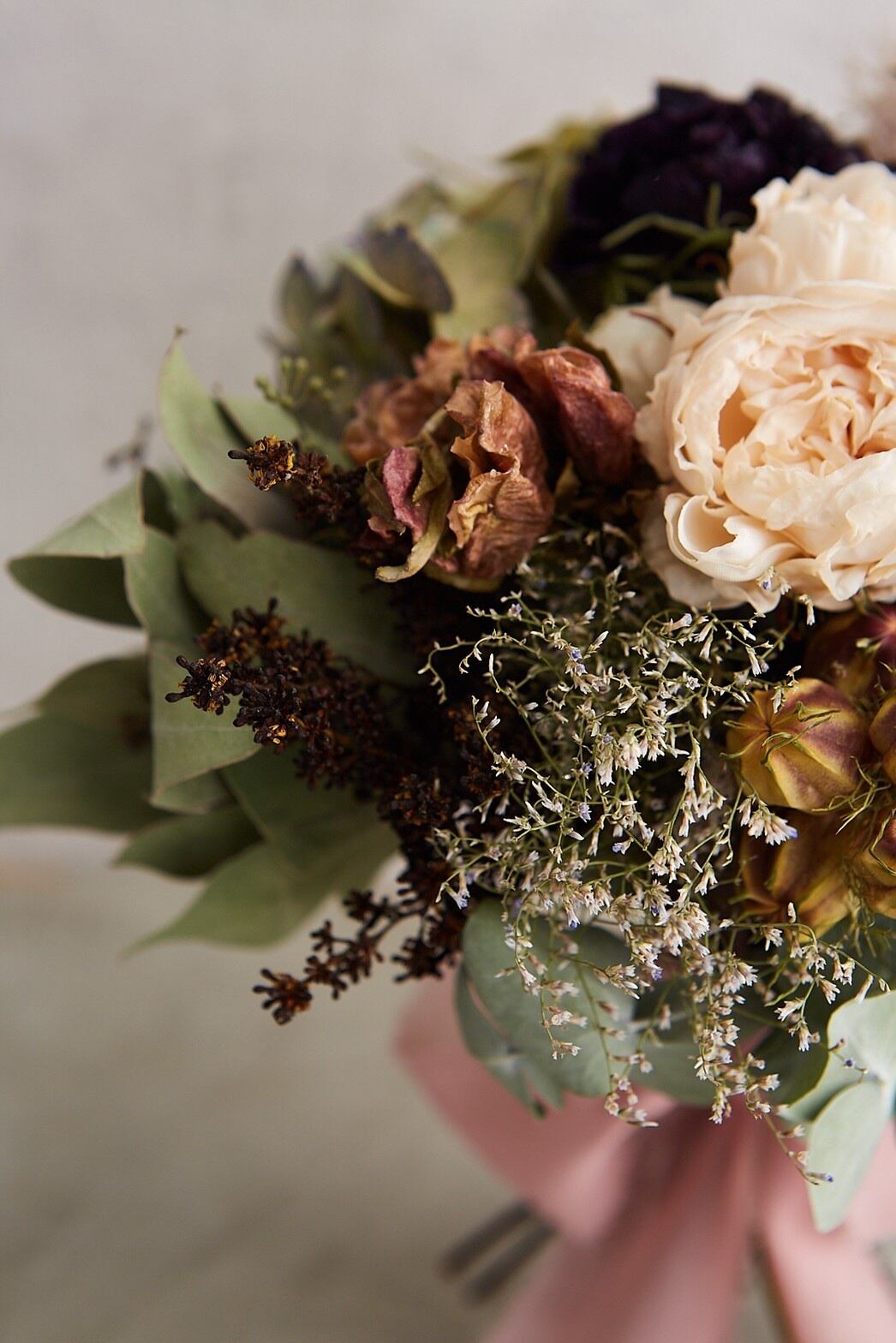 ふんわりしたラナンキュラスのドライフラワーとアートの薔薇をメインに、ベリー・実ものをあわせてブーケに仕立てました。