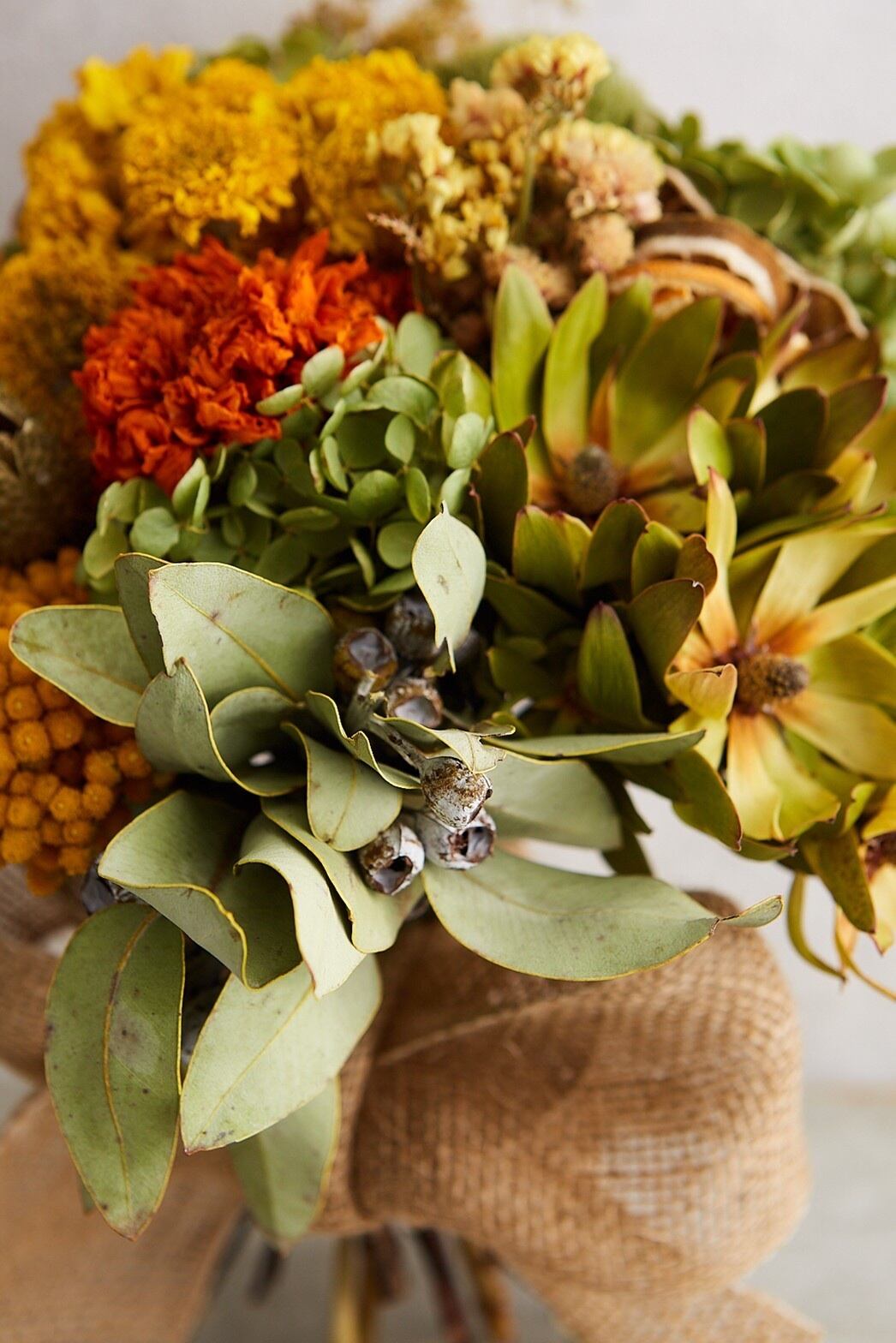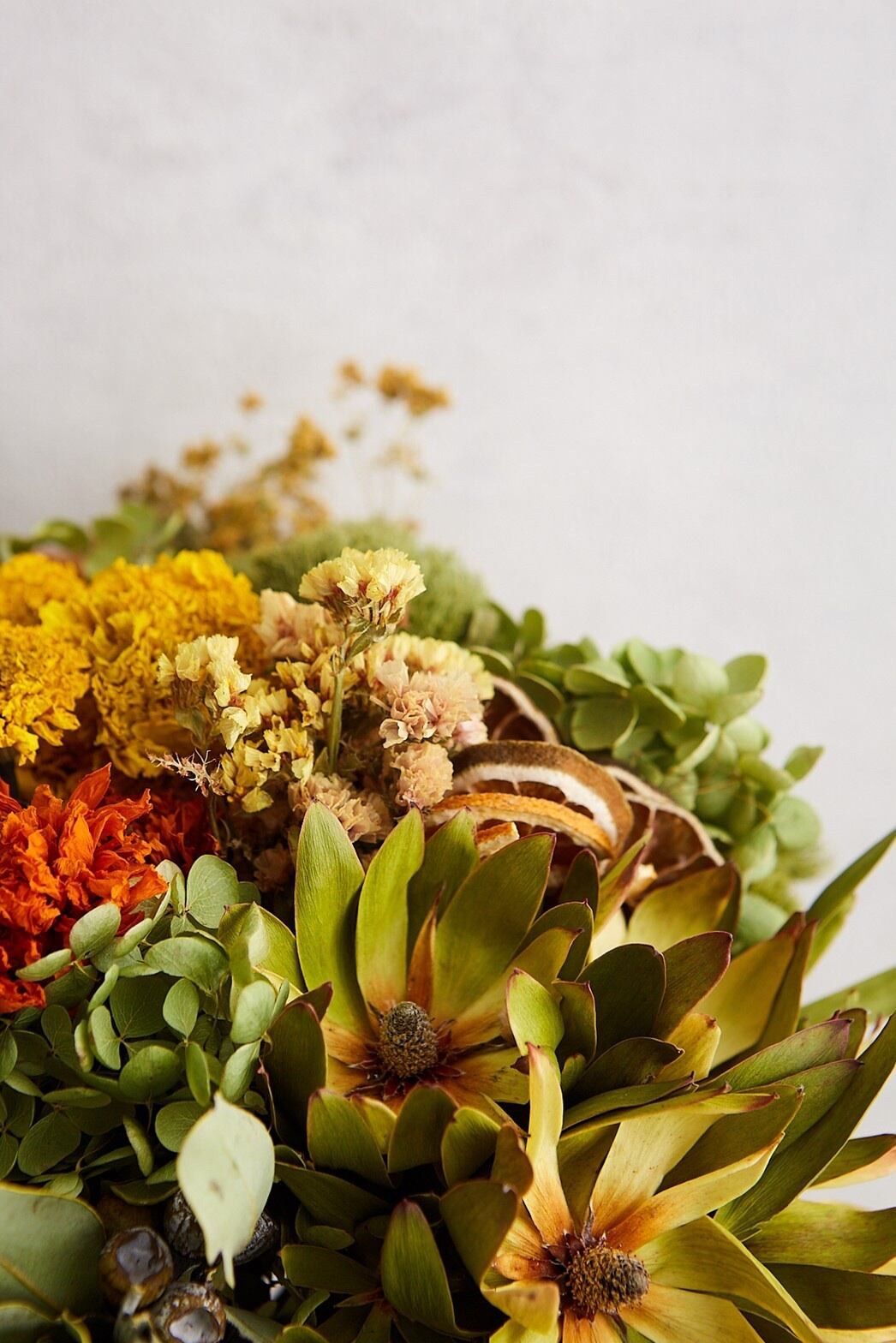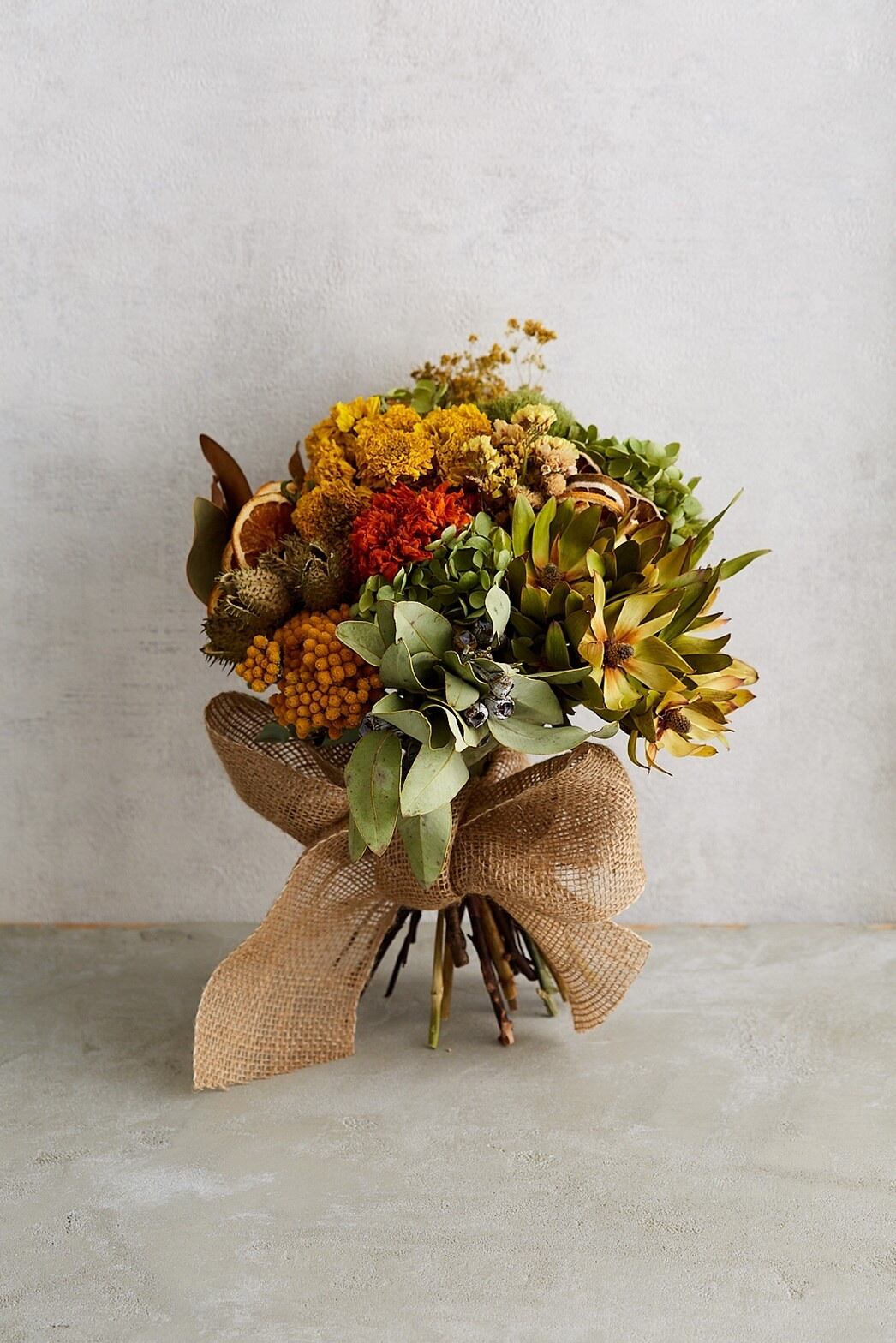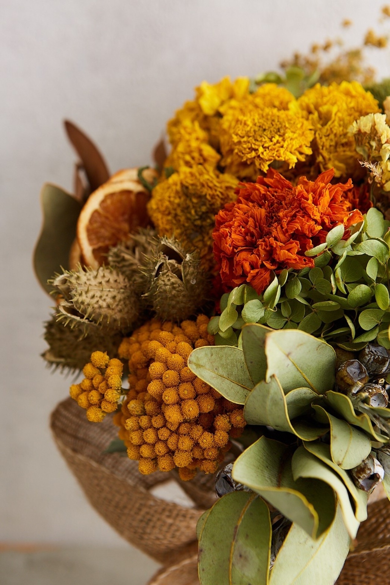 ふんわりしたラナンキュラスのドライフラワーをメインにベリー・実ものをあわせてブーケに仕立てました。