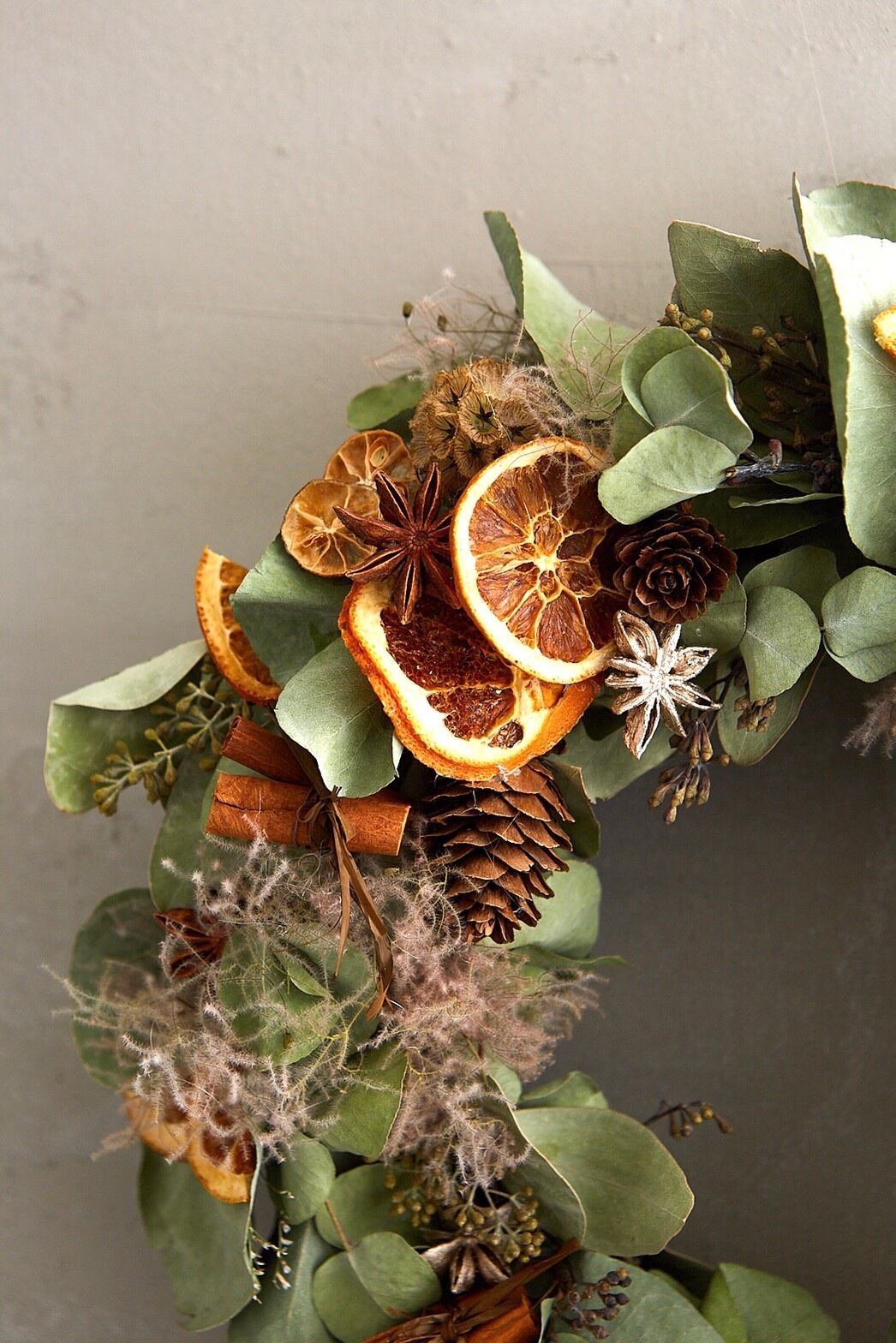 香りの良いユーカリをメインに、オレンジ、シナモン、色々な実ものとスモークツリーを使って