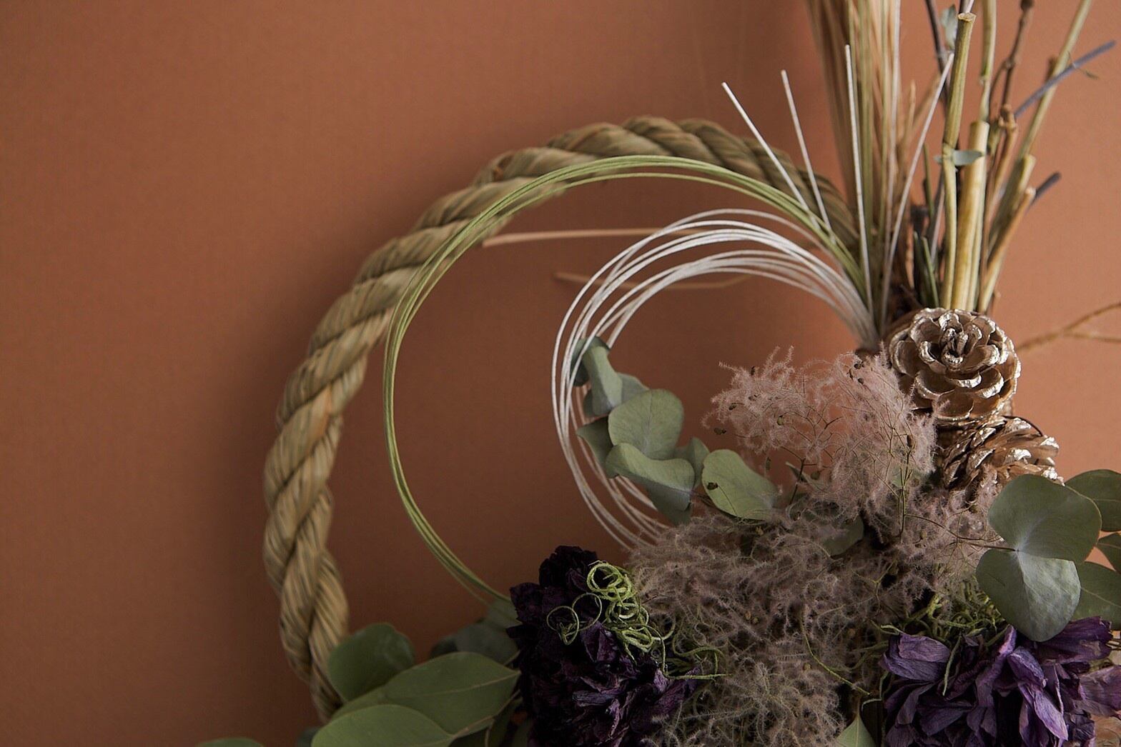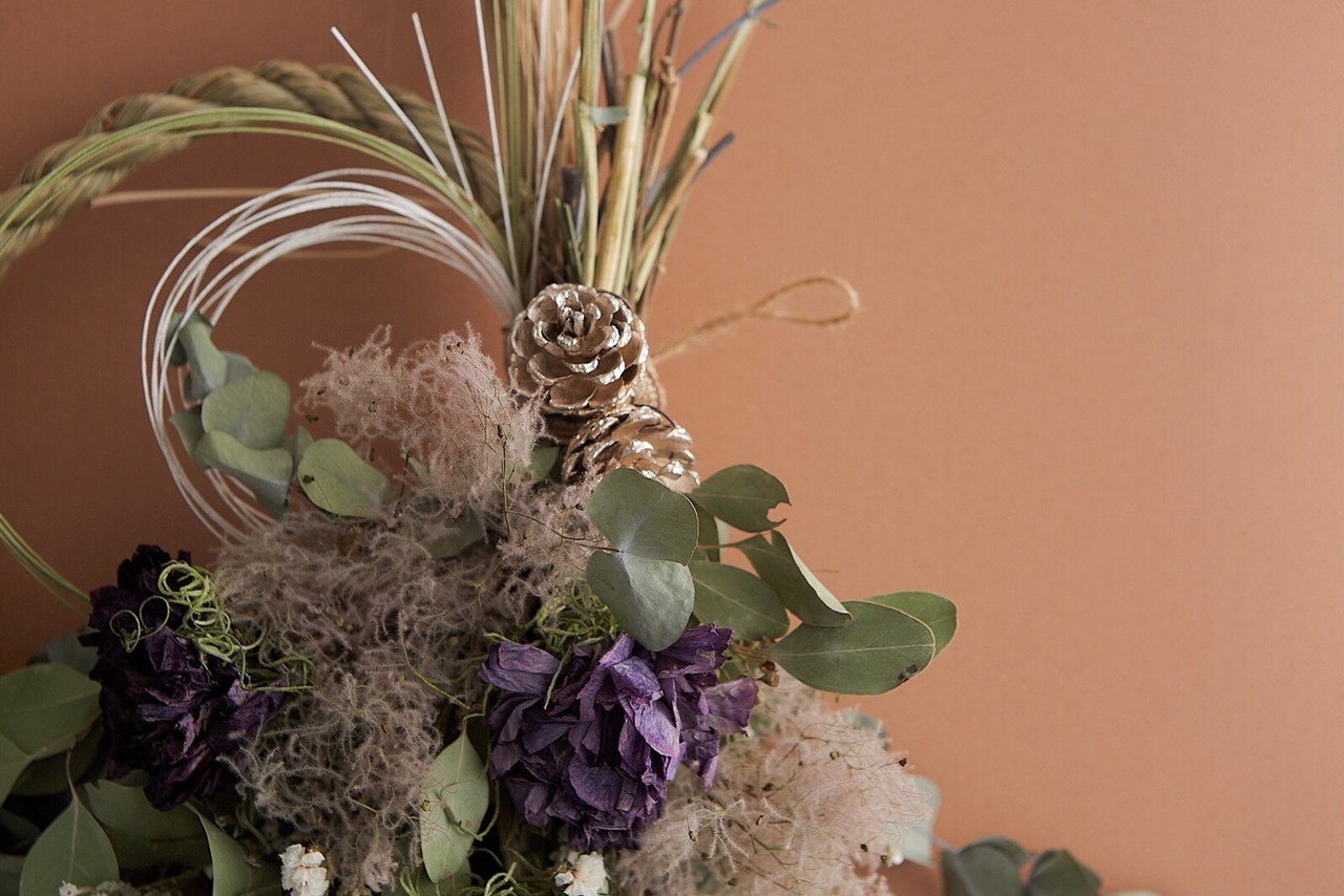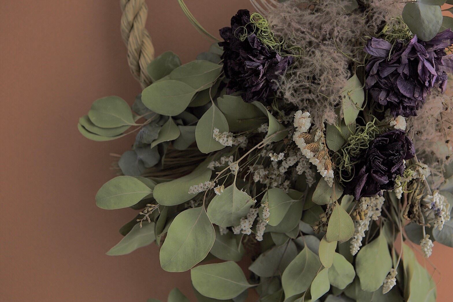 ドライフラワーの花束を束ね、水引きと共に輪飾りに取り付けました。