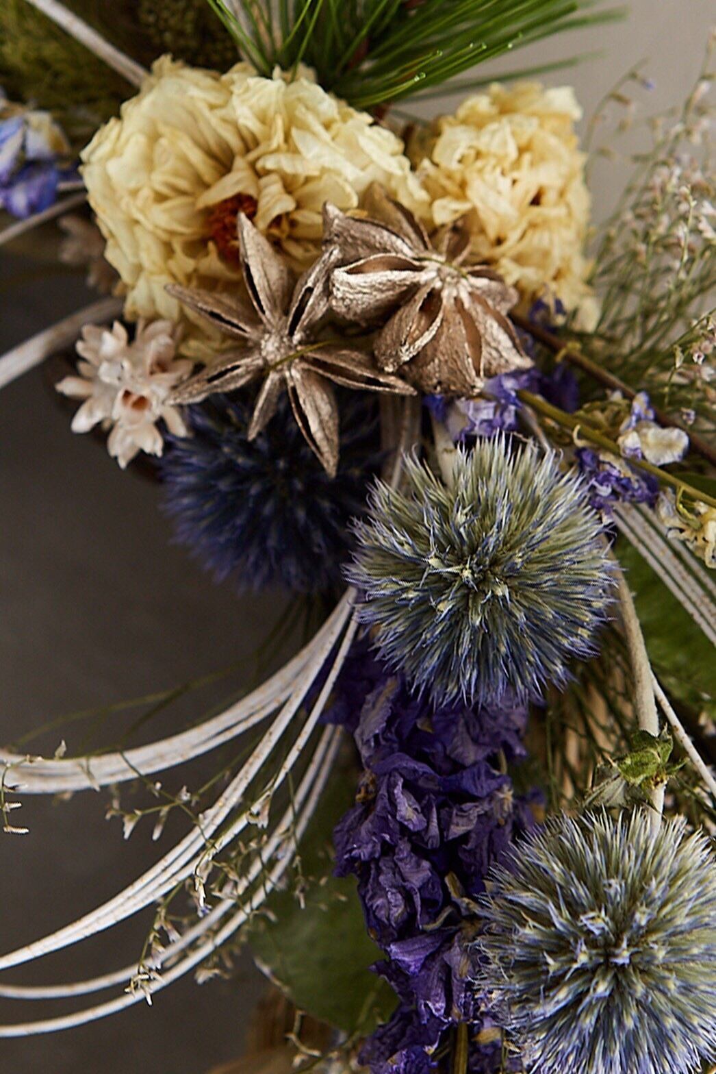 松(アート)、ダリア、ラクスパー、粟、ユーカリ、ルリ玉あざみ、スターリン、八角、木の実、水引き等