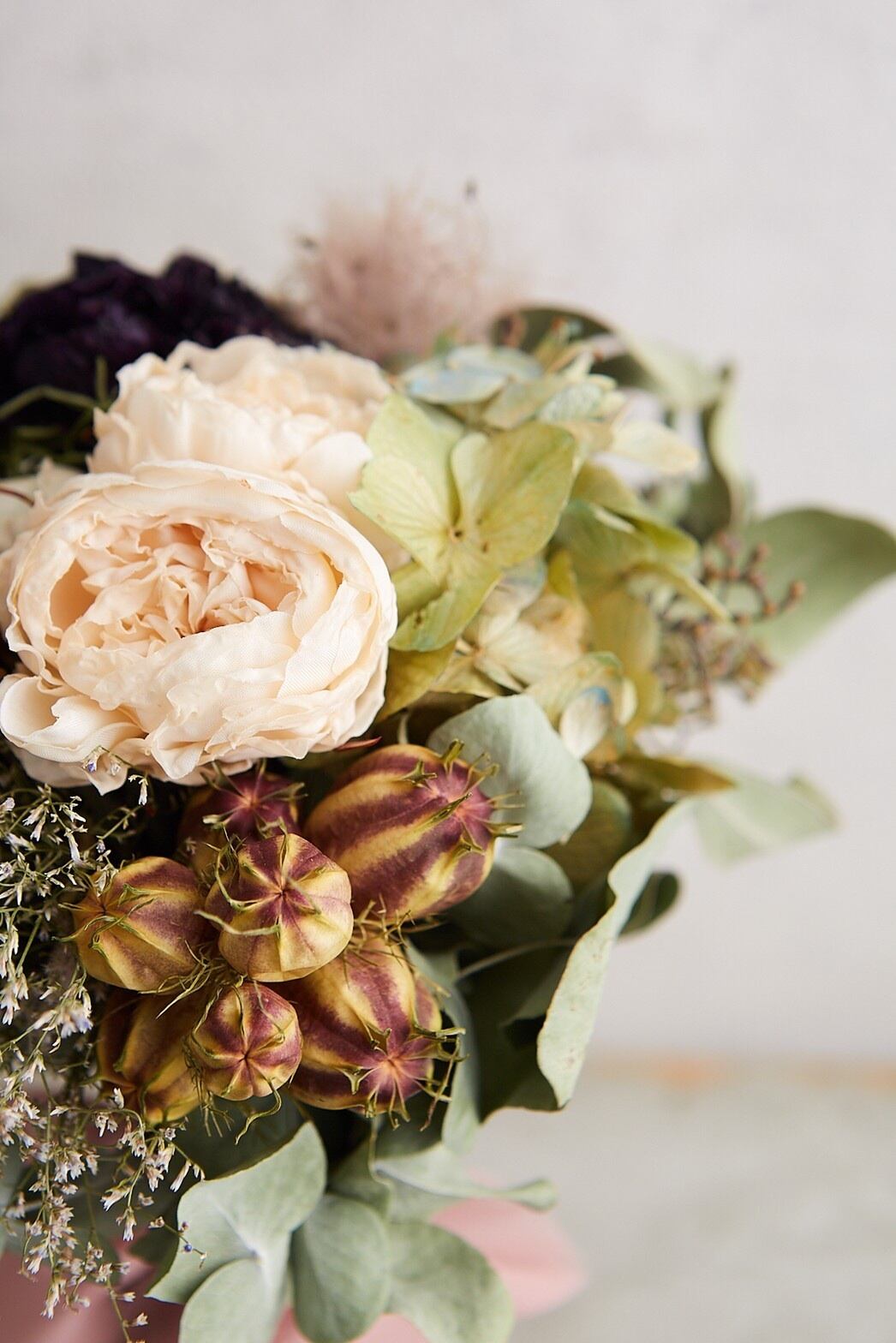 ふんわりしたラナンキュラスのドライフラワーとアートの薔薇をメインに、ベリー・実ものをあわせてブーケに仕立てました。