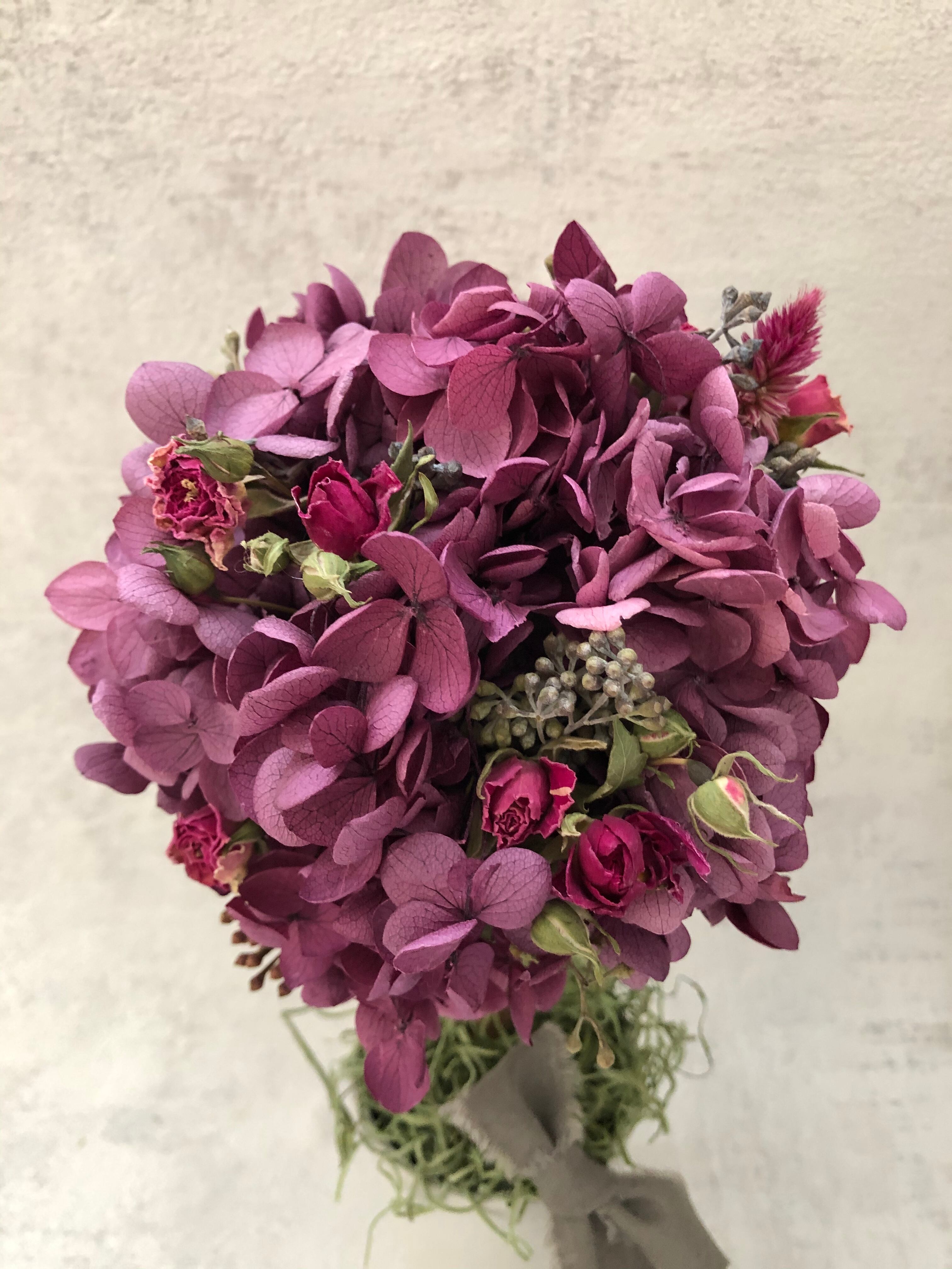 プリザーブドフラワーの紫陽花をふんだんに使い