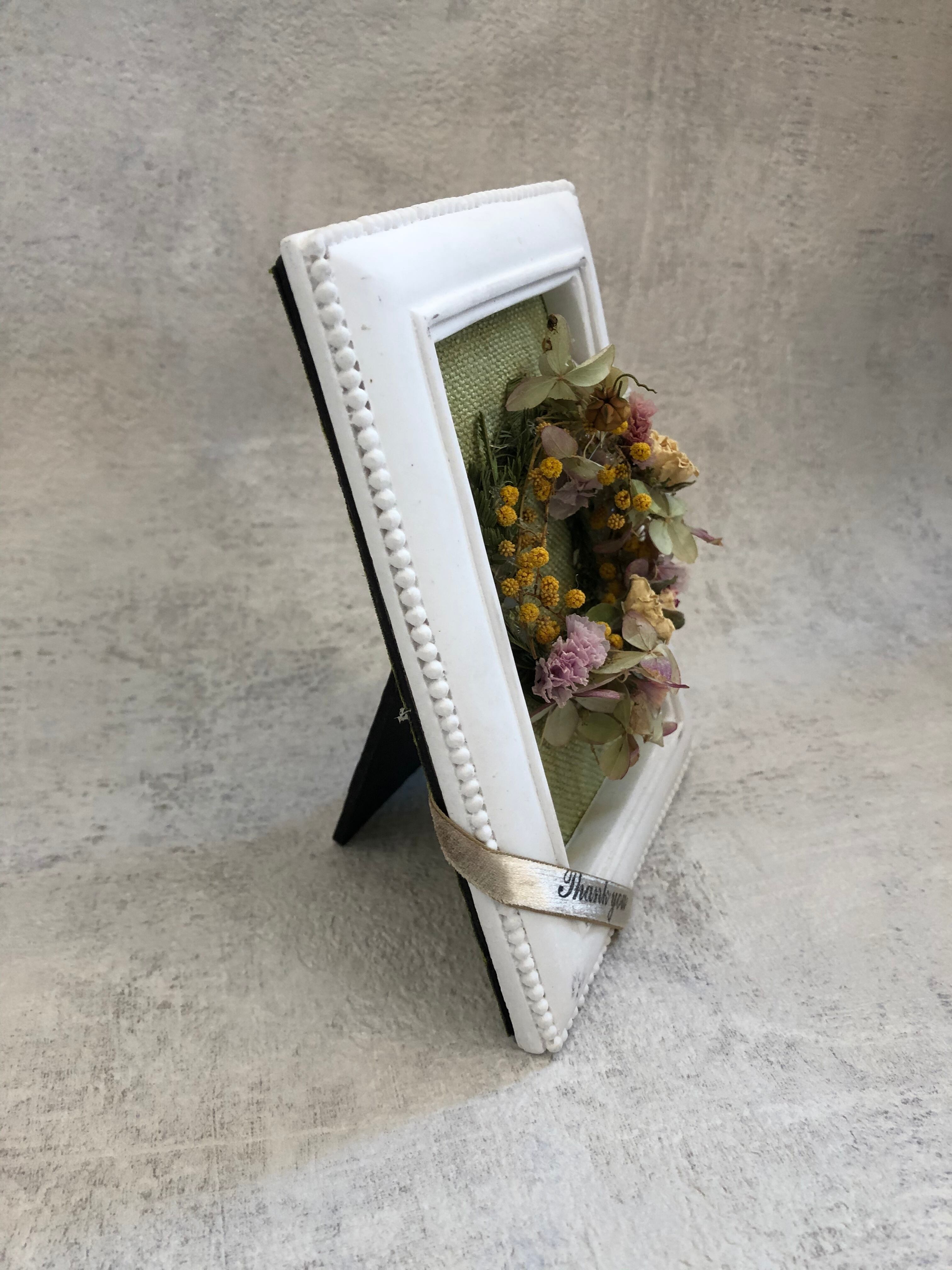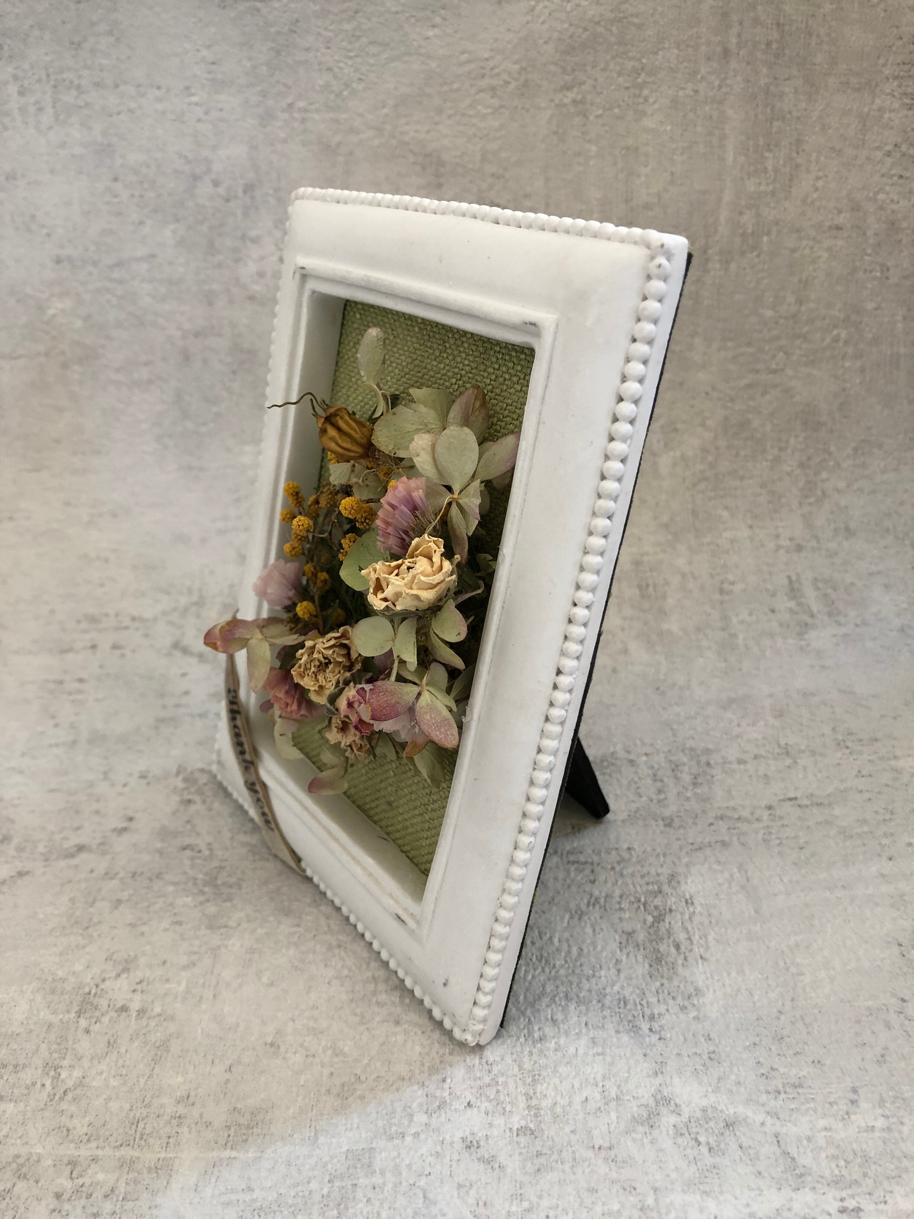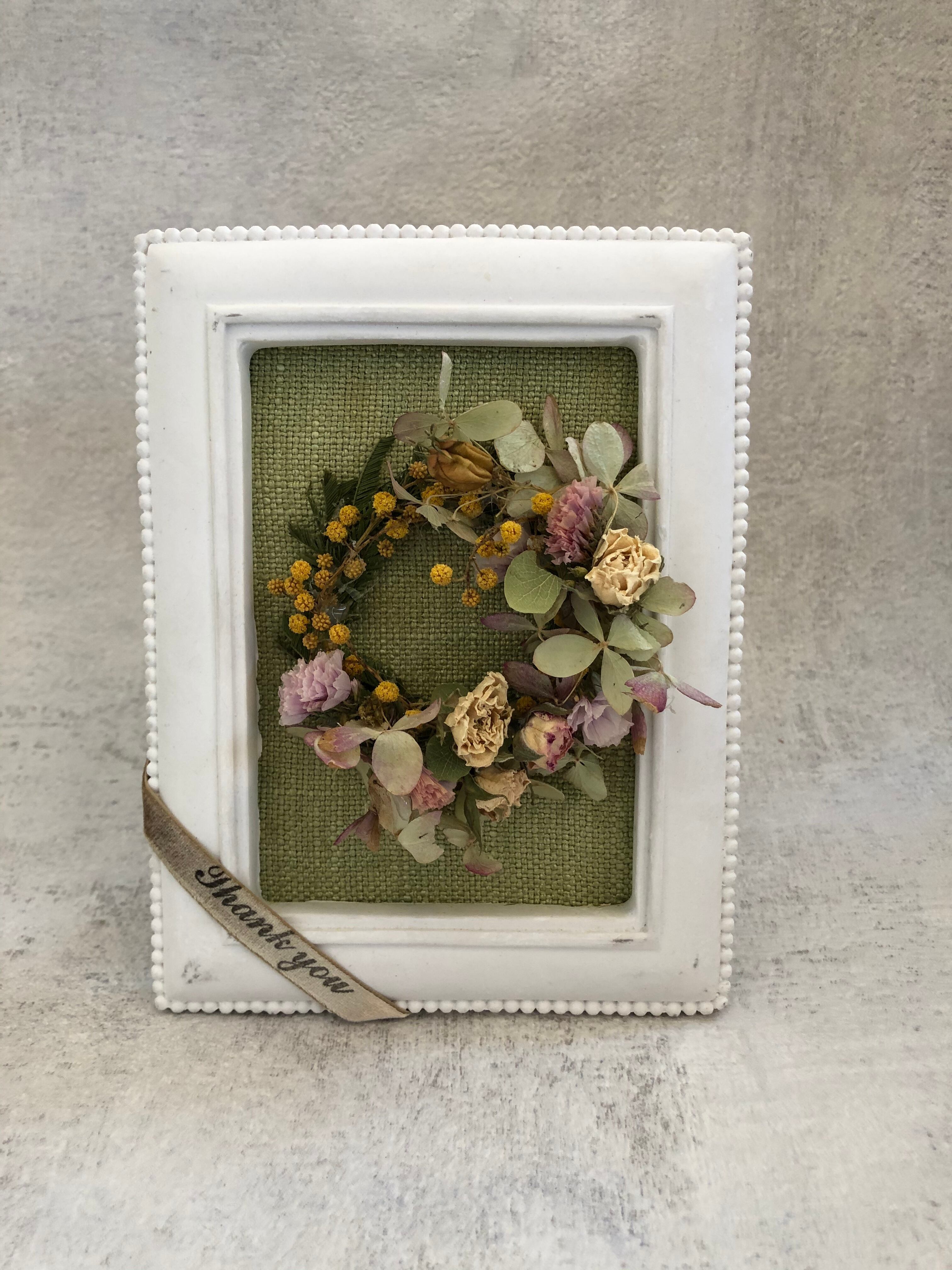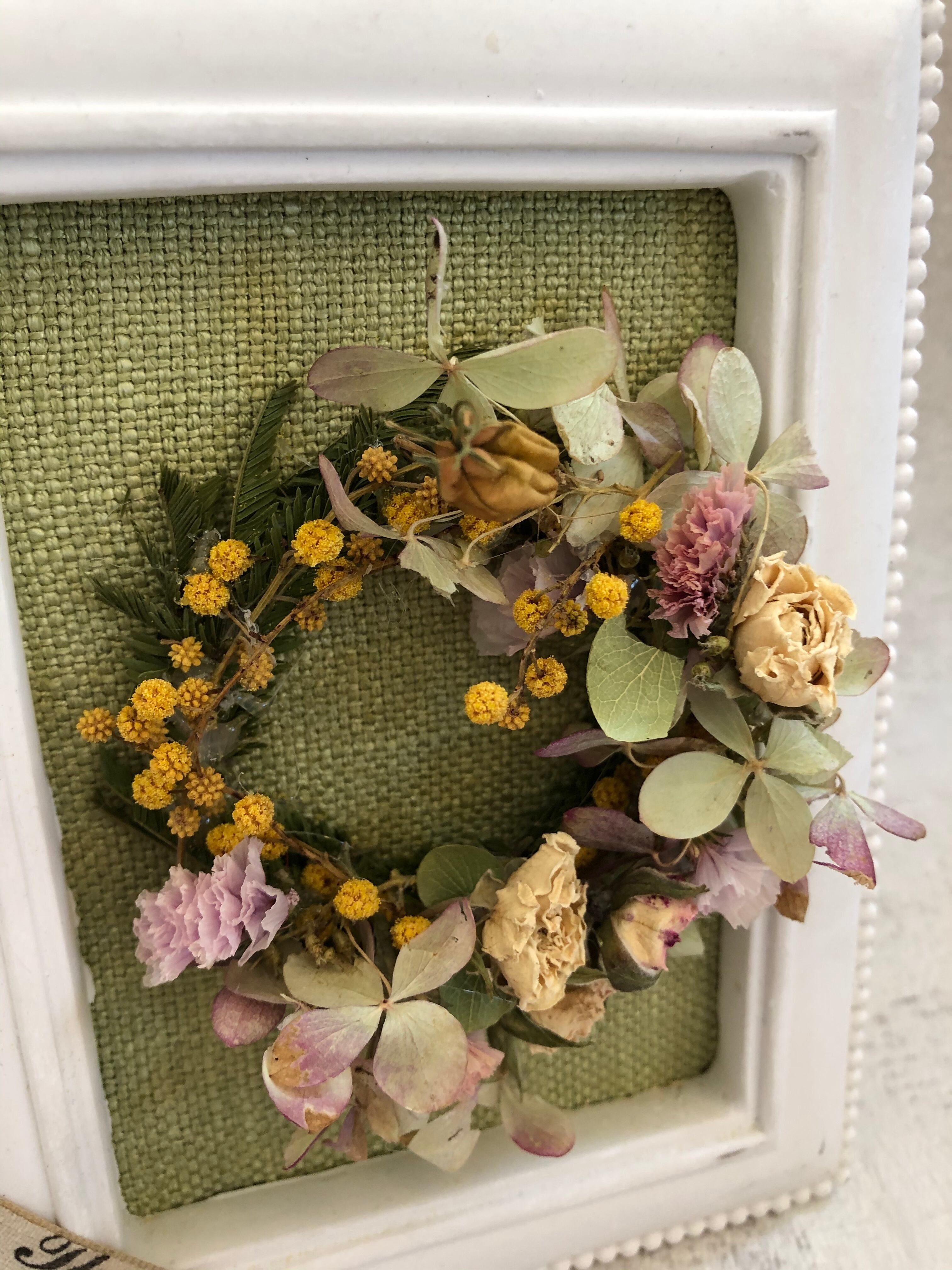 フォトフレーム型(木目調・プリント)にドライフラワーのミモザやミニバラ、紫陽花、スターチスを使ったリースを乗せました。