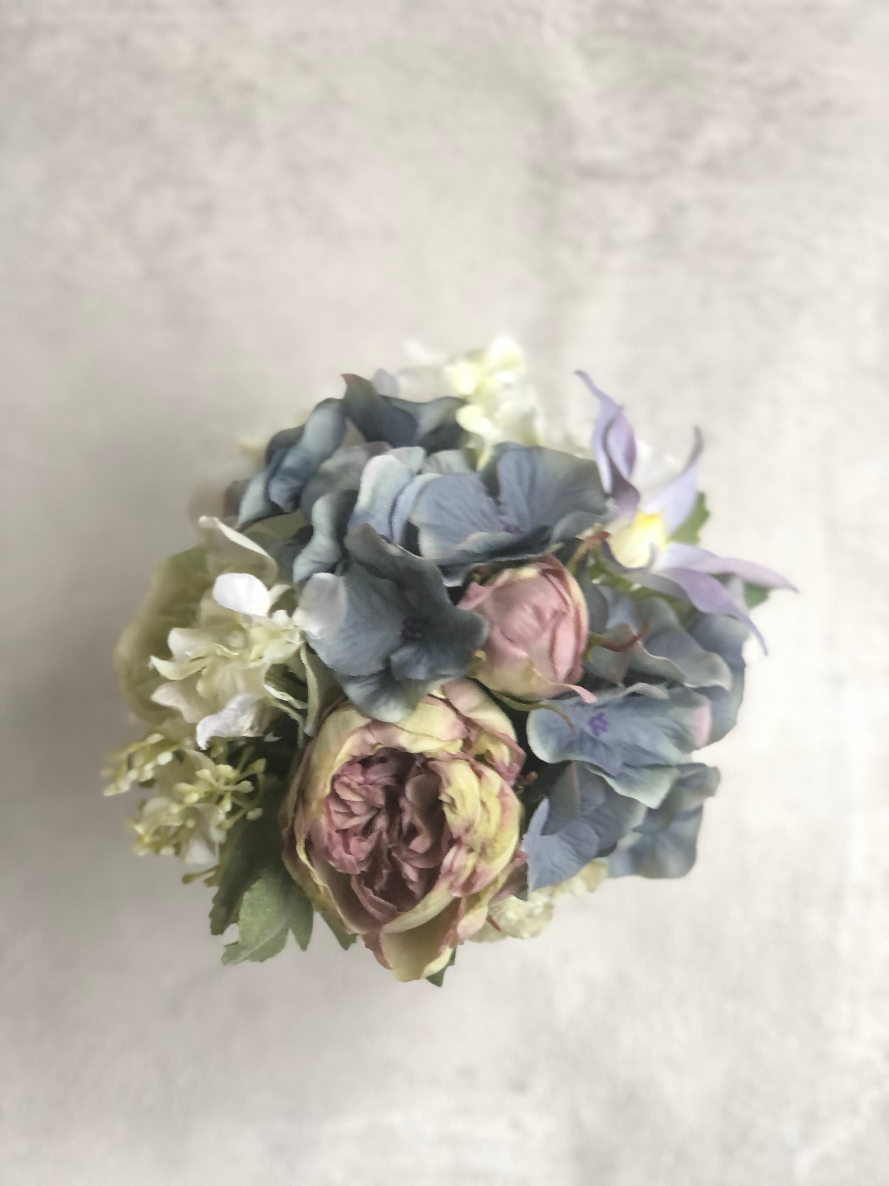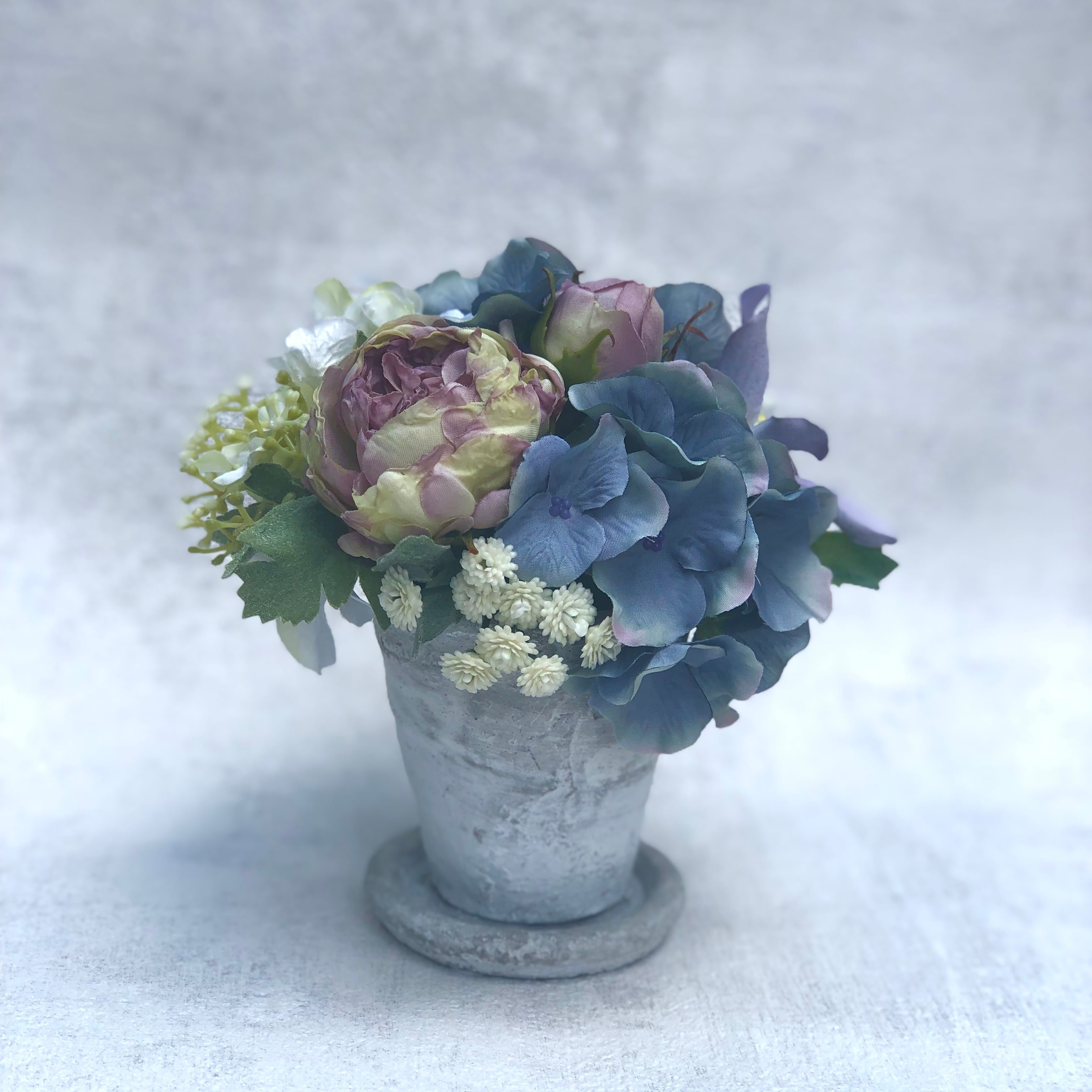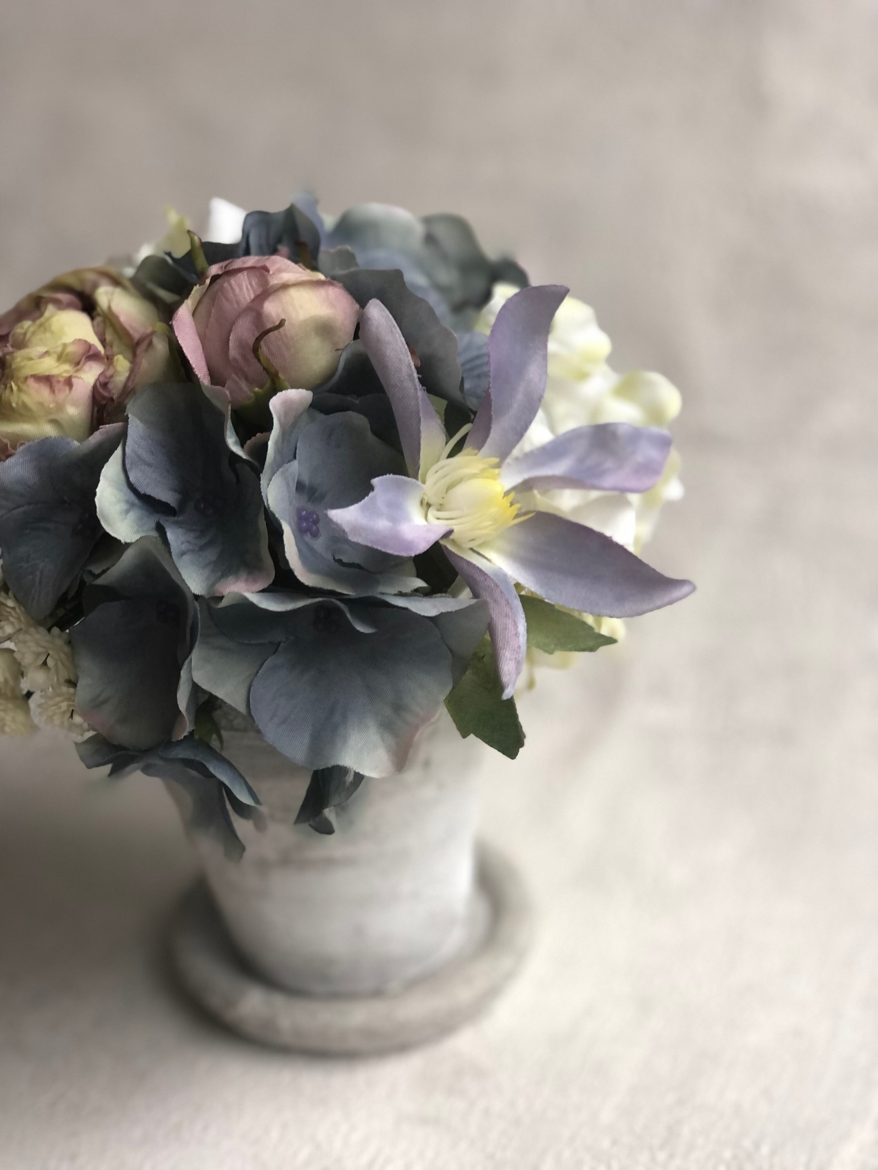 アートフラワー(布花)&白い陶器の器のアレンジメント。