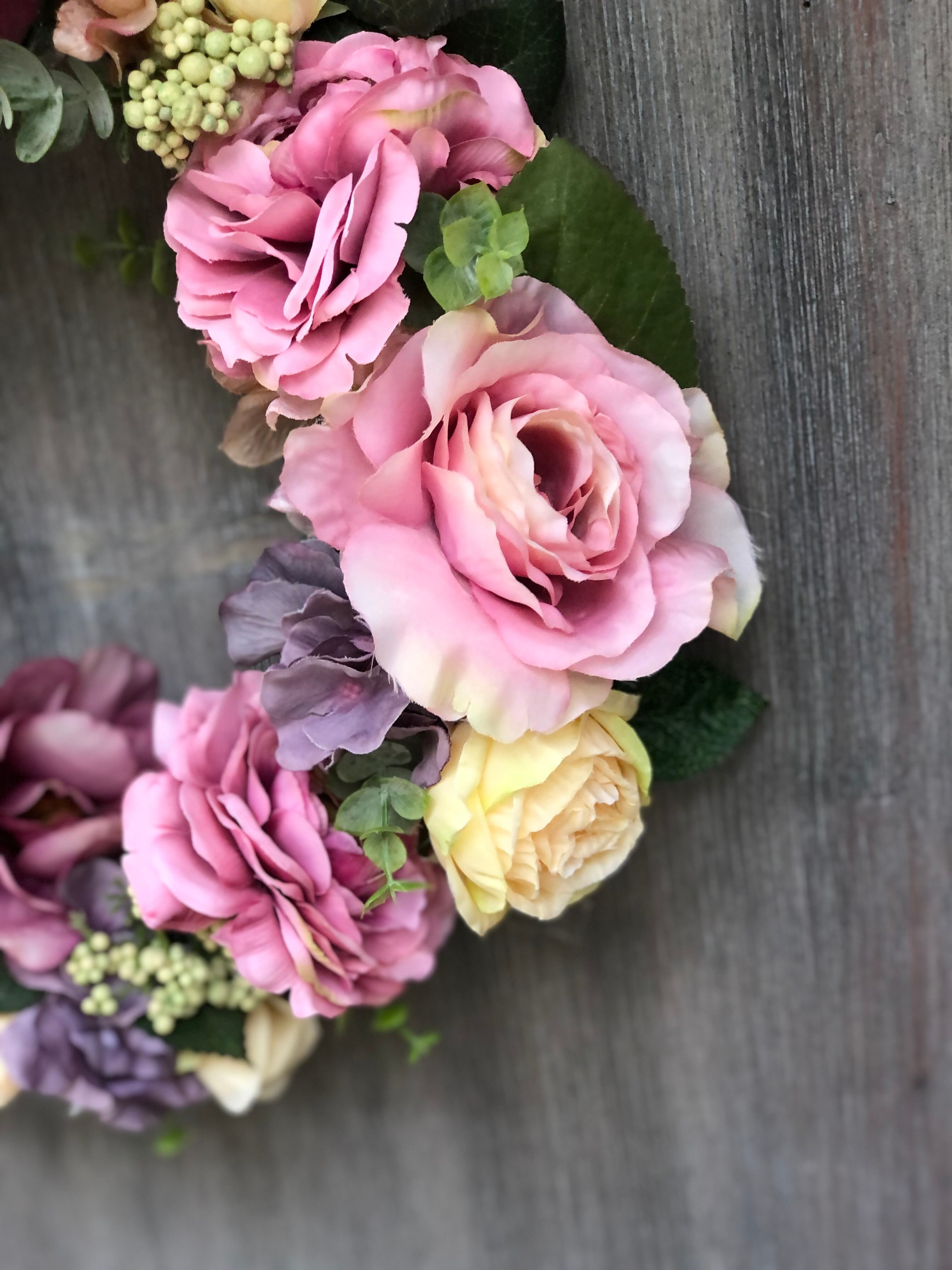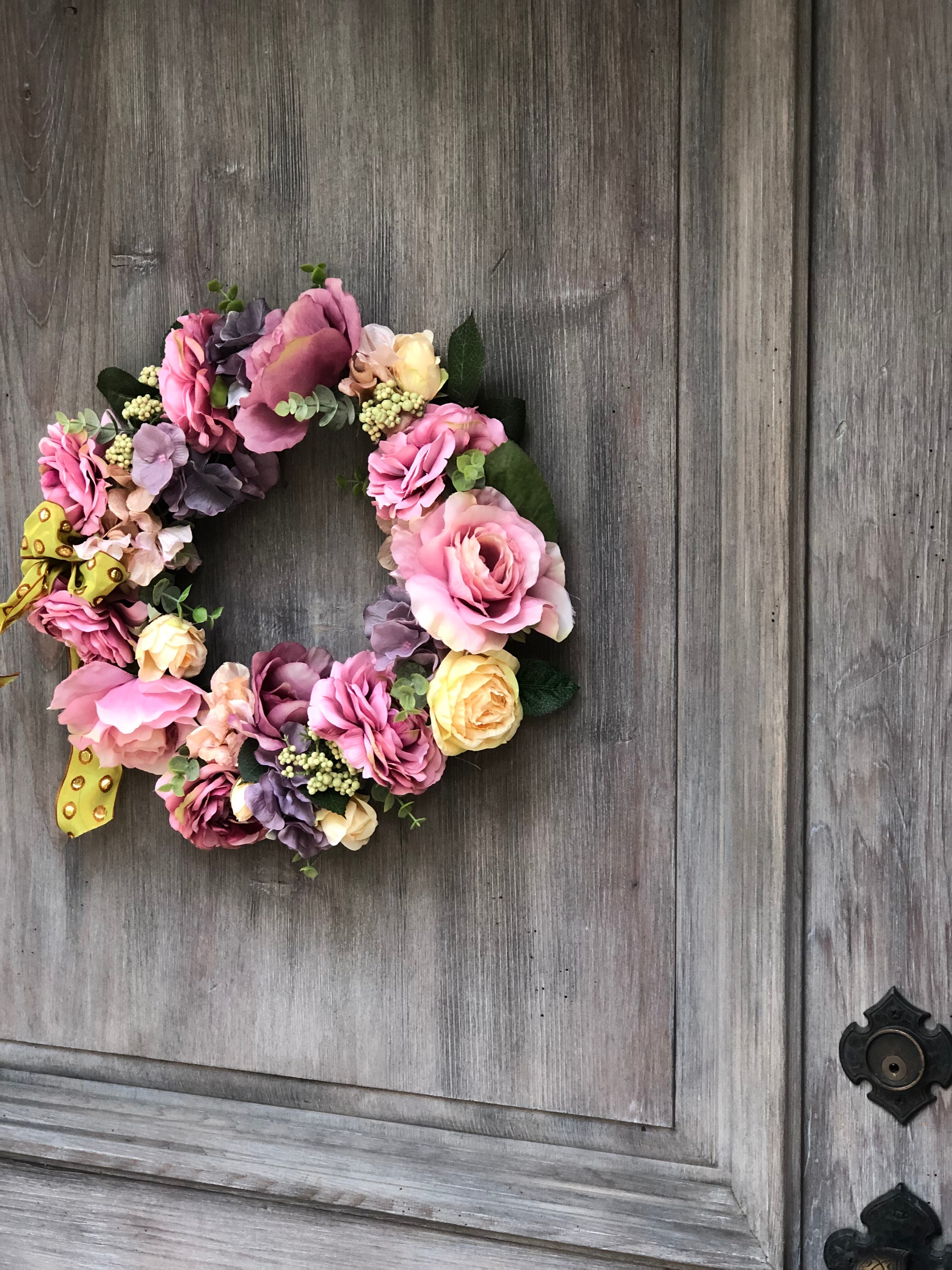梅雨どきにもお手入れ要らずで安心なアートフラワーの薔薇をふんだんに使ったリースです。