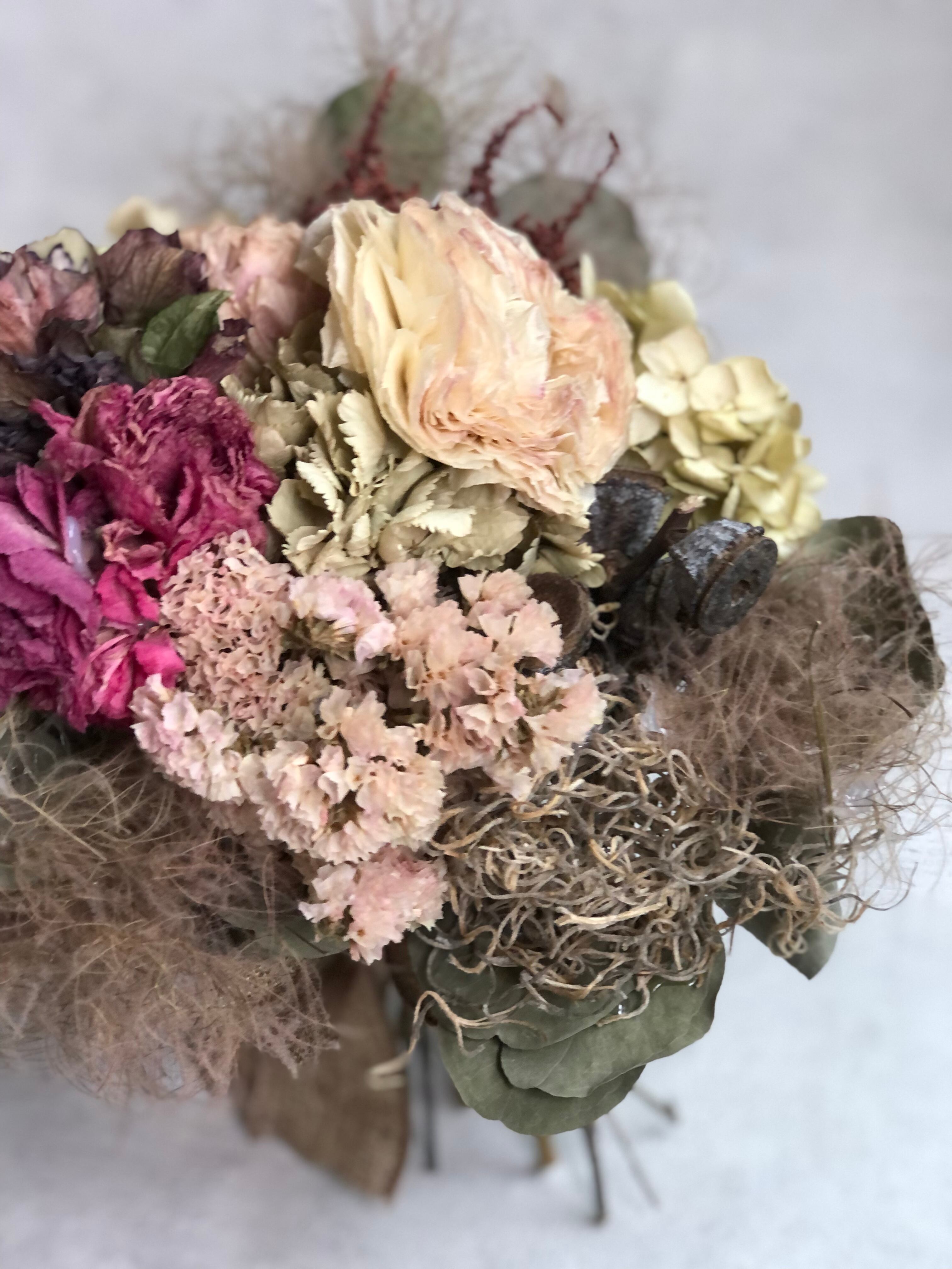 クリスマスローズ、紫陽花等一部の花材を特殊加工してあります。