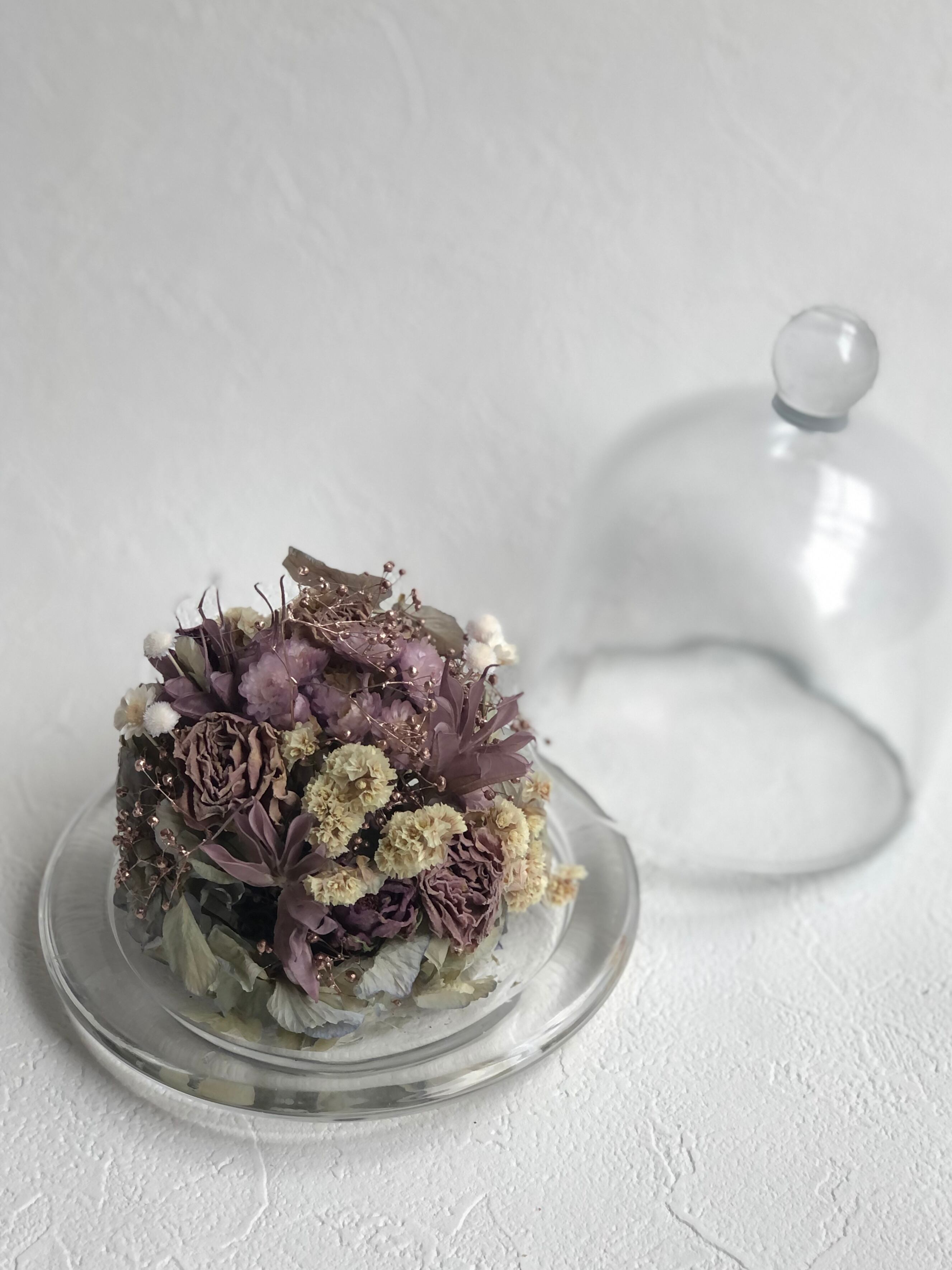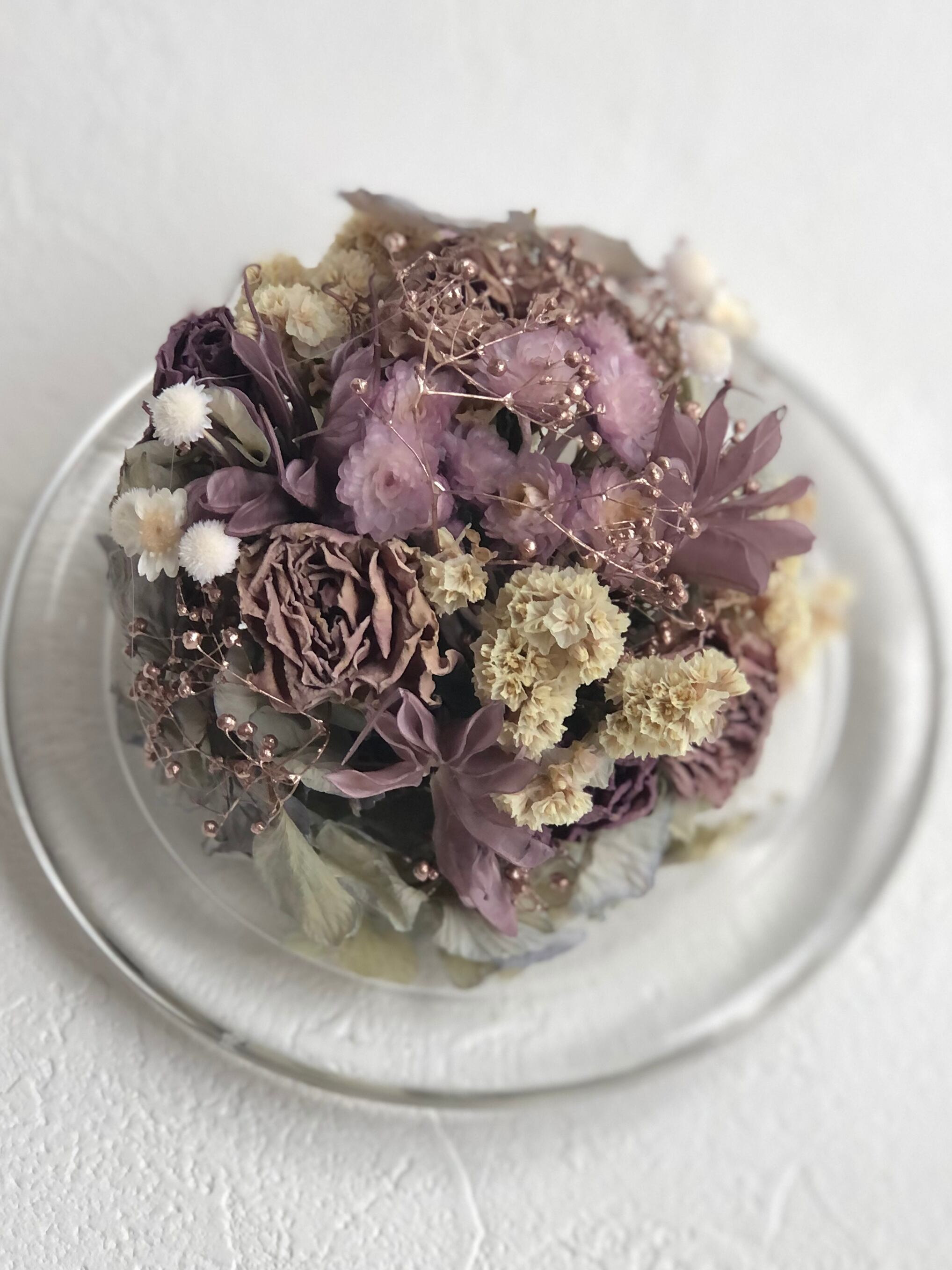 紫陽花にシックな紫の薔薇をあしらった大人の春色のドームです。