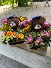 大切な方への卒業祝いに、愛らしいテディベアとフラワーアレンジをセットした贈りものはいかがでしょうか?