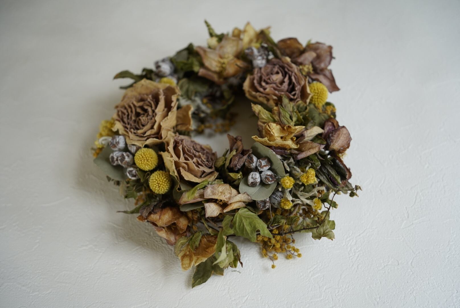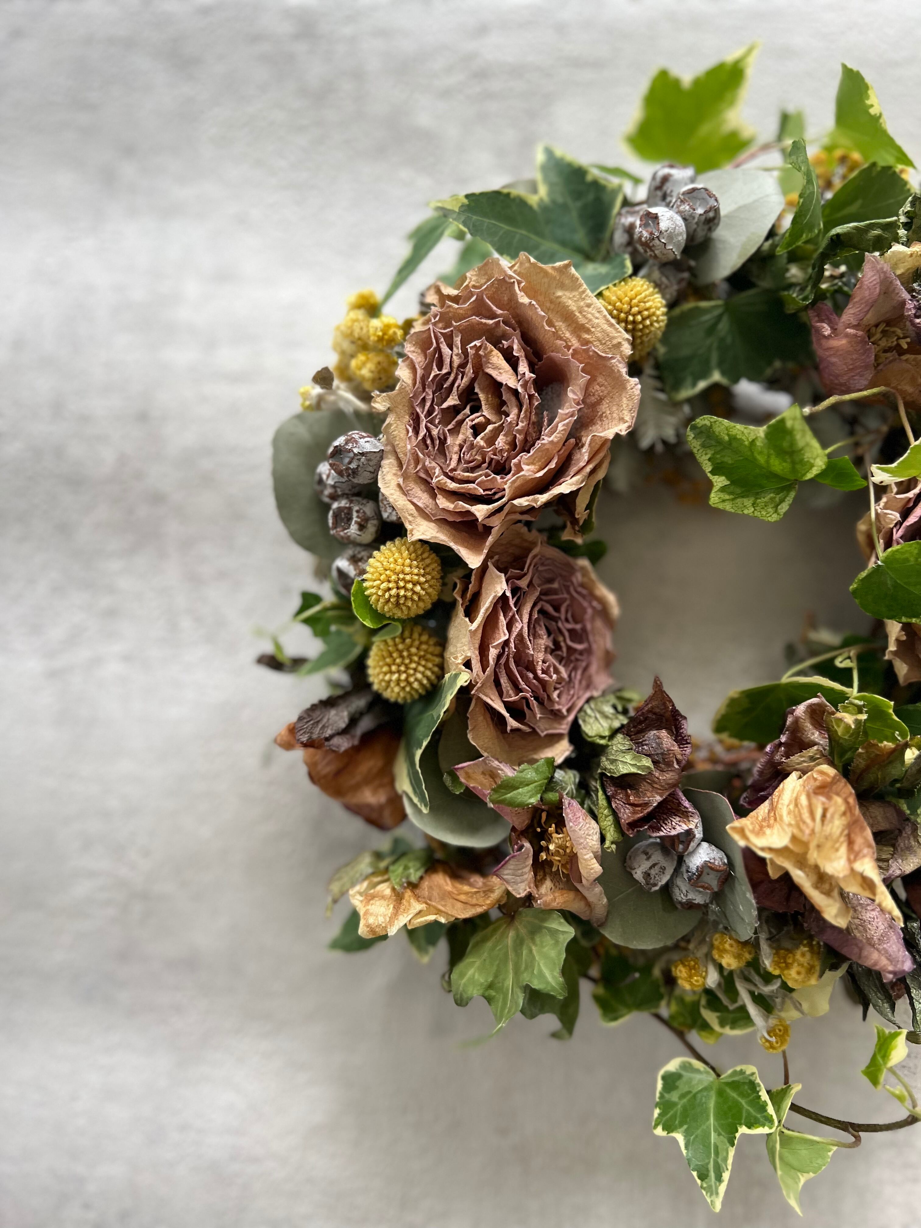リースの中心には豪華な薔薇を配置し、周りにはナチュラルな葉や花を散りばめました。